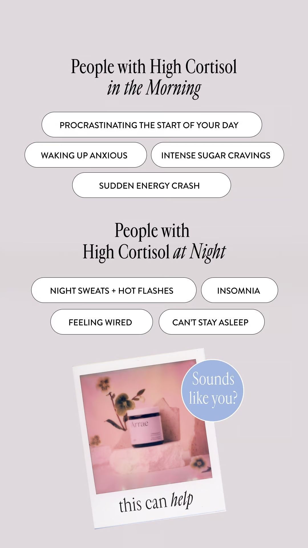 Este anuncio sigue el clásico enfoque de problema/solución con dos escenarios que se centran en personas con altos niveles de estrés que buscan relajarse durante el día y la noche.