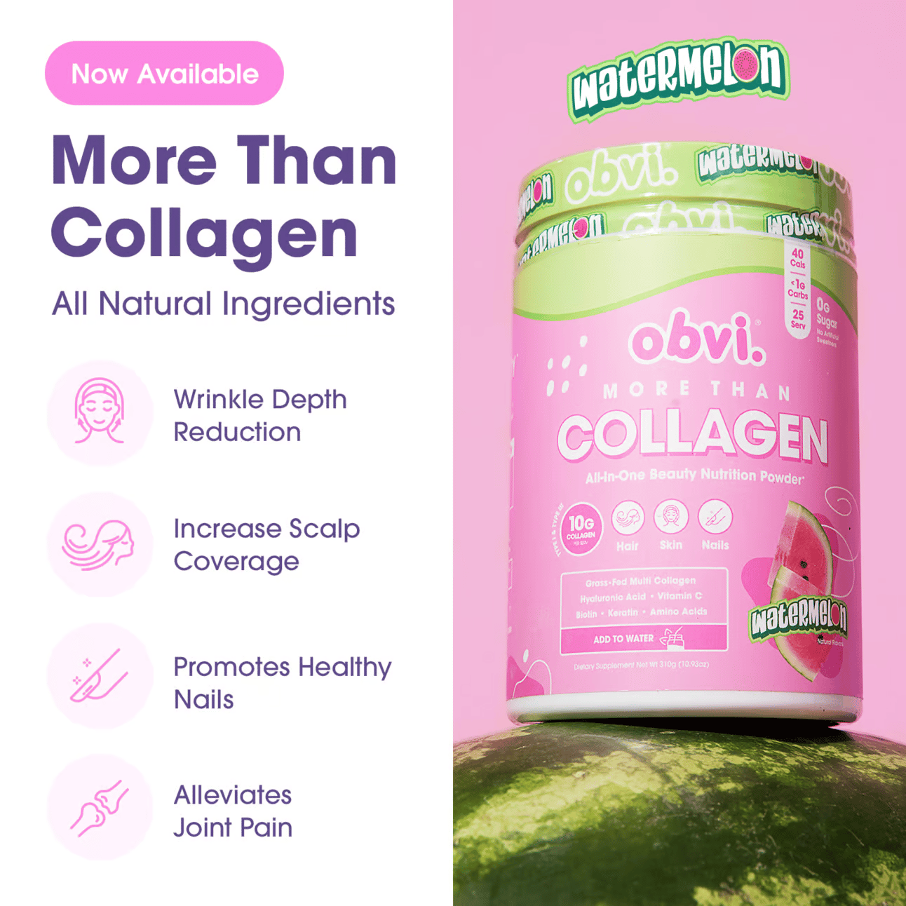 Este anuncio habla muy bien a una audiencia que ya es consciente de su necesidad de colágeno. "Más que colágeno". El encabezado lo dice claramente: sabes que necesitas colágeno, y nosotros en Obvi tenemos un colágeno que hace más que cualquier otra marca promedio de colágeno.