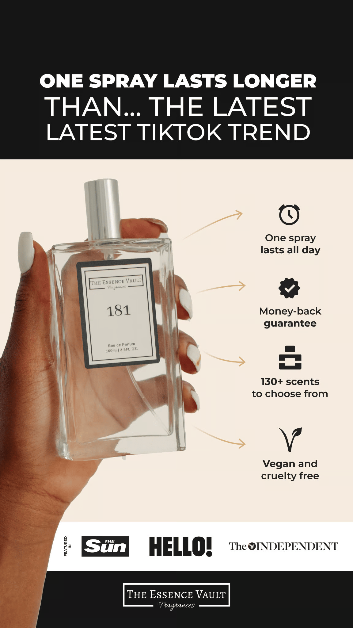 Incluye un CTA claro, una imagen del producto y beneficios que abordan los principales puntos de dolor, como la duración, la reversión de riesgo con la garantía, la cantidad de aromas y el aspecto vegano del producto. Debajo, muestran características para reforzar la prueba social. Lo único que podría faltar es un CTA al final, aunque, por otro lado, no creo que siempre sea necesario en un diseño estático.